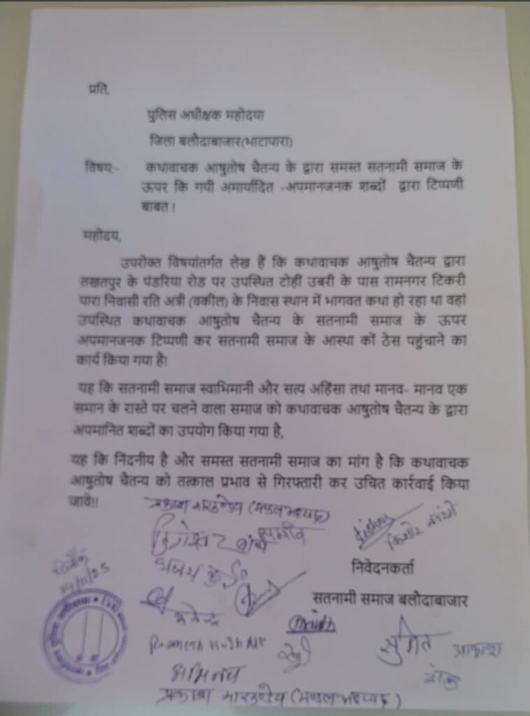 सौंपकर कथा वाचक के विरुद्ध एफआईआर दर्ज कर कठोर कार्रवाई की मांग की है। आवेदन में उल्लेख किया गया है कि भागवत कथा मंच से वाचक ने सतनामी समाज को गाय काटने वाले और मूर्ख लोग कहकर अपमानित किया जो न केवल समाज की भावना को आहत करता है बल्कि सामाजिक वैमनस्य और सांप्रदायिक तनाव उत्पन्न करने वाला है। सतनामी समाज ने इसे अपनी आस्था और गरिमा पर सीधा हमला बताया है। समाज के लोगों ने कहा कि ऐसे वक्तव्य किसी भी रूप में स्वीकार्य नहीं हैं और प्रशासन को तत्काल सख्त कदम उठाने चाहिए।