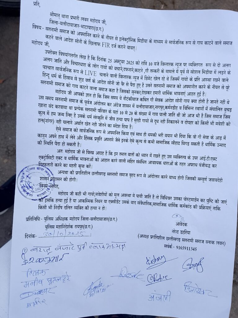 ब्लाक ईकाई लवन प्रगतिशील छत्तीसगढ़ सतनामी समाज ने बड़ा कदम उठाते हुए विस्तार न्यूज़ चैनल के लाइव डिबेट में आदेश सोनी द्वारा दिए गए अपमानजनक बयान पर एफआईआर दर्ज करने की मांग की है। समाज ने आरोप लगाया है कि आदेश सोनी ने 25 अक्टूबर 2025 की रात एक टीवी डिबेट में पूरे सतनामी समाज को “गाय काटने वाला समाज” कहकर धार्मिक और सामाजिक रूप से अपमानित किया है।